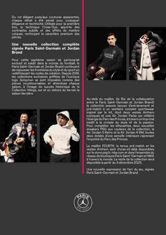 除球衣(這是巴黎與喬丹品牌合作的第15款球衣)之外,該系列還將訓(xùn)練服與賽前著裝,同受比賽服啟發(fā)的完整運(yùn)動(dòng)生活服飾相結(jié)合。其中包括兩款標(biāo)志性的Anthem夾克,以及一件以獨(dú)特印花融合風(fēng)格與激情、旨在頌揚(yáng)王子公園球場(chǎng)活力的Air Jordan派克大衣。為完善整體造型,系列還推出兩款以該系列配色為主題的新款巴黎運(yùn)動(dòng)鞋:Air Jordan 5 Retro和Air Jordan 4 RM,二者均配備印有王子公園球場(chǎng)圖案的鞋墊。