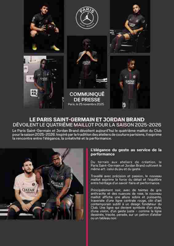 11月25日訊 官方消息,巴黎與喬丹品牌于今日公布了俱樂(lè)部2025-26賽季的第四款球衣。其設(shè)計(jì)靈感源自巴黎時(shí)裝工坊的傳統(tǒng),詮釋了優(yōu)雅、創(chuàng)意與性能的融合。