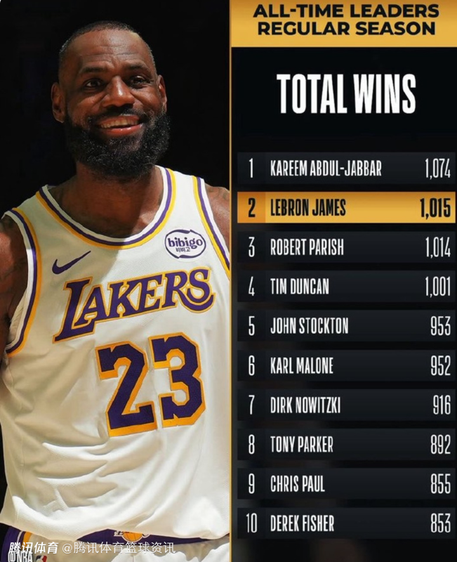 北京時(shí)間12月9日,昨天湖人擊敗76人的比賽,詹姆斯?fàn)顟B(tài)回暖,拿到29分7籃板6助攻,這也是詹姆斯生涯第1015場(chǎng)常規(guī)賽勝利,超越“酋長(zhǎng)”羅伯特帕里什,升至歷史第二,僅次于賈巴爾(1074場(chǎng))。