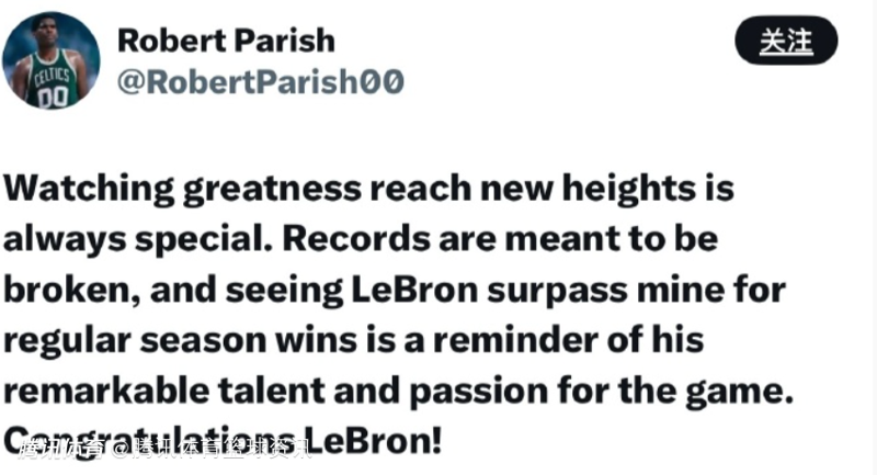 常規(guī)賽勝場(chǎng)數(shù)被詹姆斯超越!帕里什發(fā)推祝賀:見證偉大再攀新高很特別
