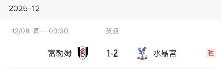 12月08日訊 英超第15輪,水晶宮在客戰2-1戰勝富勒姆,此輪過后,水晶宮近6場英超只1-2輸曼聯,打進8球丟3球,聯賽居第4。