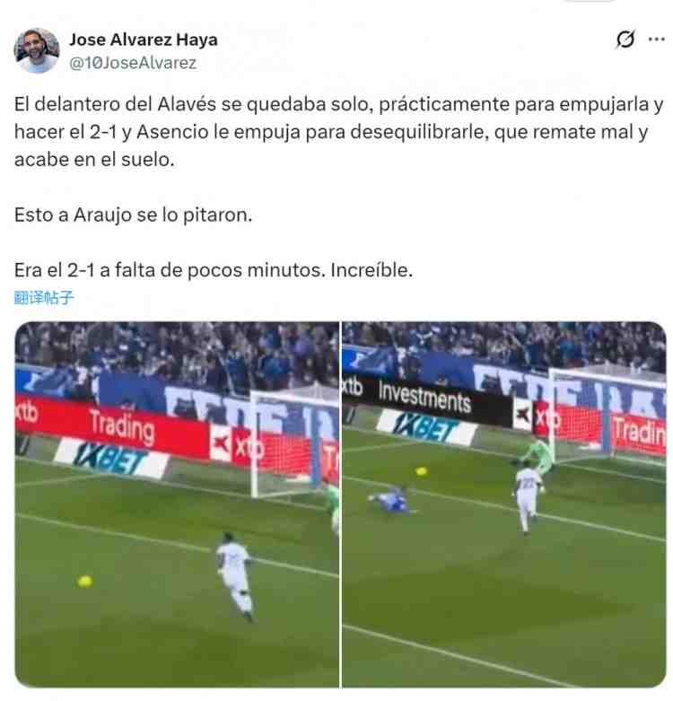 記者Jose Alvarez Haya社媒寫道:“阿拉維斯前鋒當(dāng)時(shí)已直面門將,幾乎可以輕松將球推入球門,將比分改寫為2-1。而阿森西奧從身后推搡,使他失去平衡,導(dǎo)致射門偏出并摔倒在地。阿勞霍此前(類似情況)就被判了點(diǎn)球。”